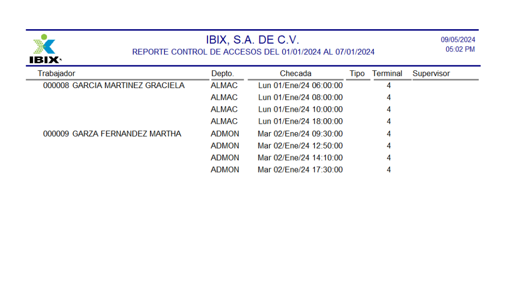 Este informe proporciona un desglose completo de las checadas realizadas en las Unidades de Control de Acceso. Incluye información sobre la fecha y hora de cada acceso, el tipo de registro (entrada o salida), la identificación del dispositivo utilizado, así como el supervisor que autorizó el acceso, si fue necesario