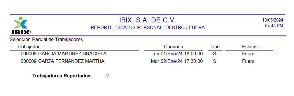 Este reporte permite identificar el personal que se encuentra dentro y fuera de las instalaciones, basado en las checadas de entrada y salida. La información puede organizarse según el registro de entrada o salida, o por número de trabajador. También es posible generar un reporte que muestre exclusivamente al personal que se encuentra dentro o fuera.
