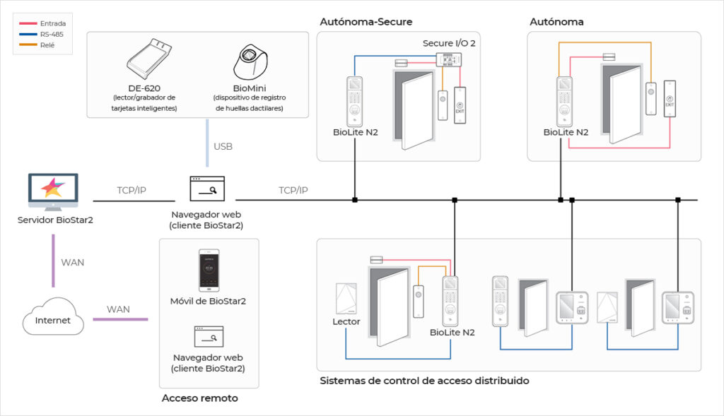 BioLite N2 no solo viene con una interfaz TCP/IP, sino también con más interfaces tradicionales (RS-485, Wiegand) para proporcionar mayor flexibilidad y múltiples opciones de instalación para diferentes entornos. También ofrece 2 entradas internas y 1 salida de relevador interna para el control de dispositivos periféricos. Los puertos de E/S pueden expandirse con el accesorio Secure I/O.