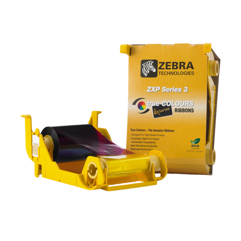 El Ribbon Zebra Color YMCKO 800033-340 es una cinta de impresión diseñada para las impresoras Zebra ZXP Series 3. Esta cinta tiene cinco paneles (YMCKO: Amarillo, Magenta, Cian, Negro y Superposición) y puede imprimir hasta 280 imágenes por rollo. Utiliza tecnología de transferencia térmica para producir impresiones de alta calidad con colores vibrantes y nítidos.