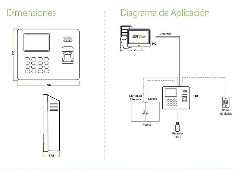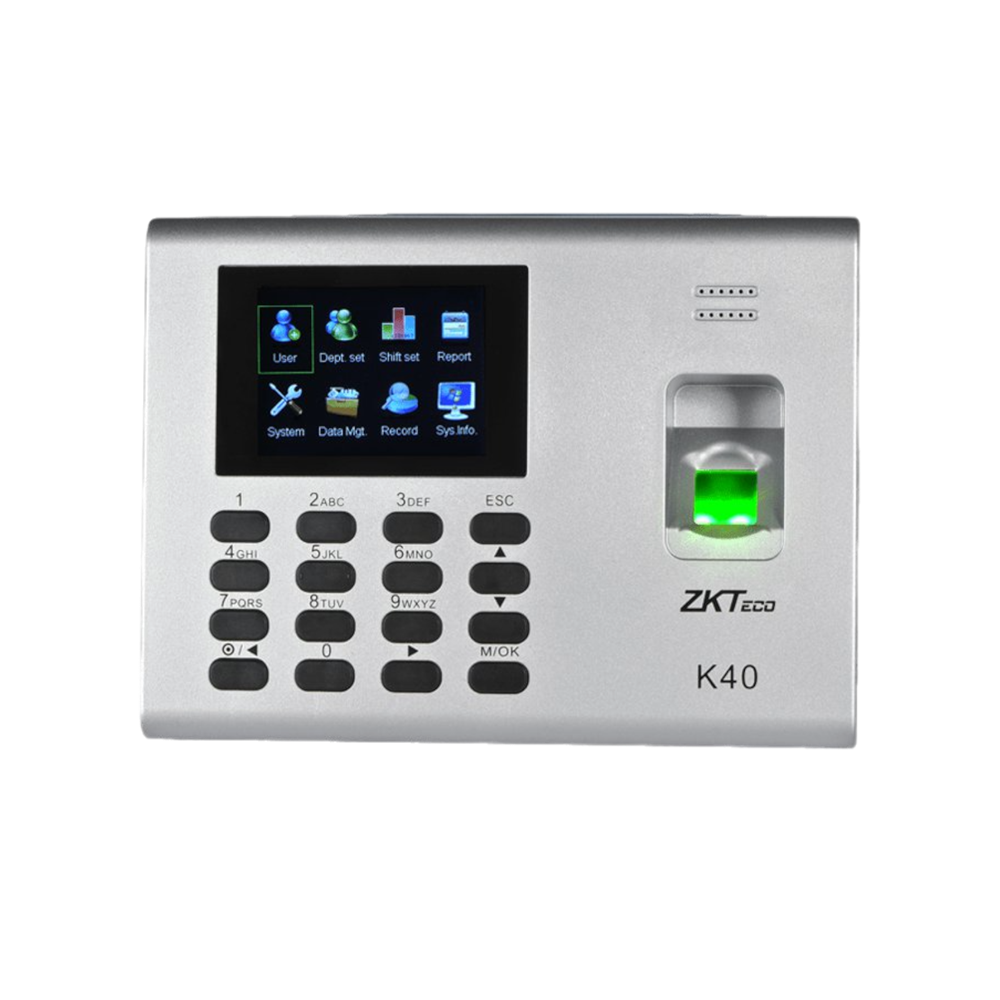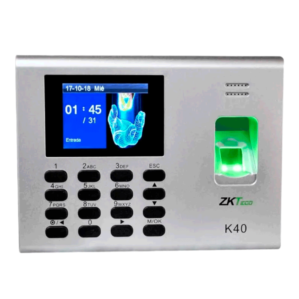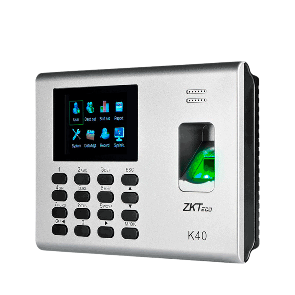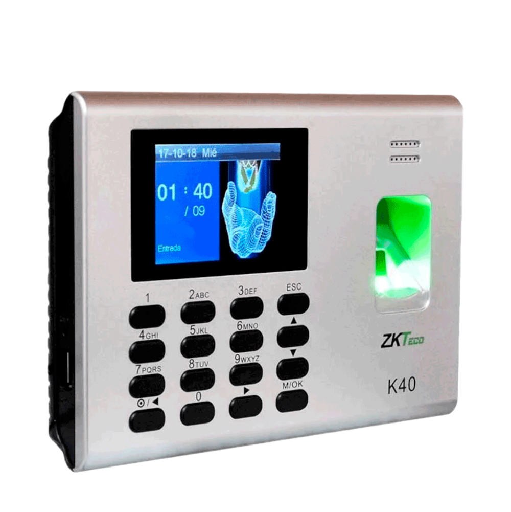 ZKTeco-K40 es una elegante e innovadora terminal biométrica IP diseñada para aplicaciones de tiempo y asistencia de empleados con funciones de control de acceso simple. Es posible administrarlo por red a través de su interfaz TCP/IP y cuenta con un puerto USB para la transferencia manual de datos o realizar la exportación del reporte de asistencia en formato de Excel. Lo más importante, la batería de reserva incorporada elimina las molestias que causan las fallas en el suministro eléctrico.
