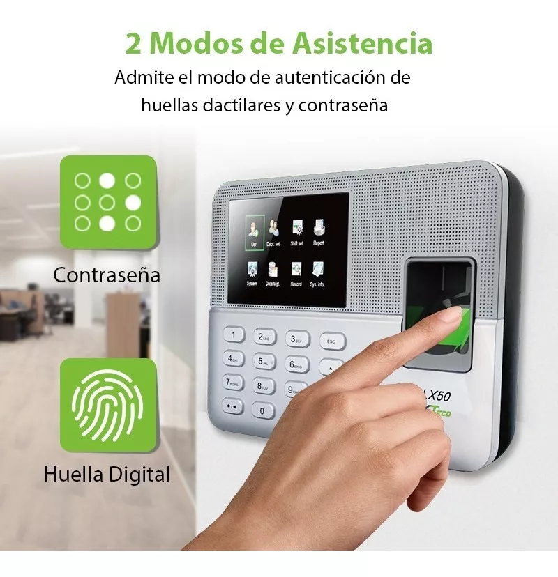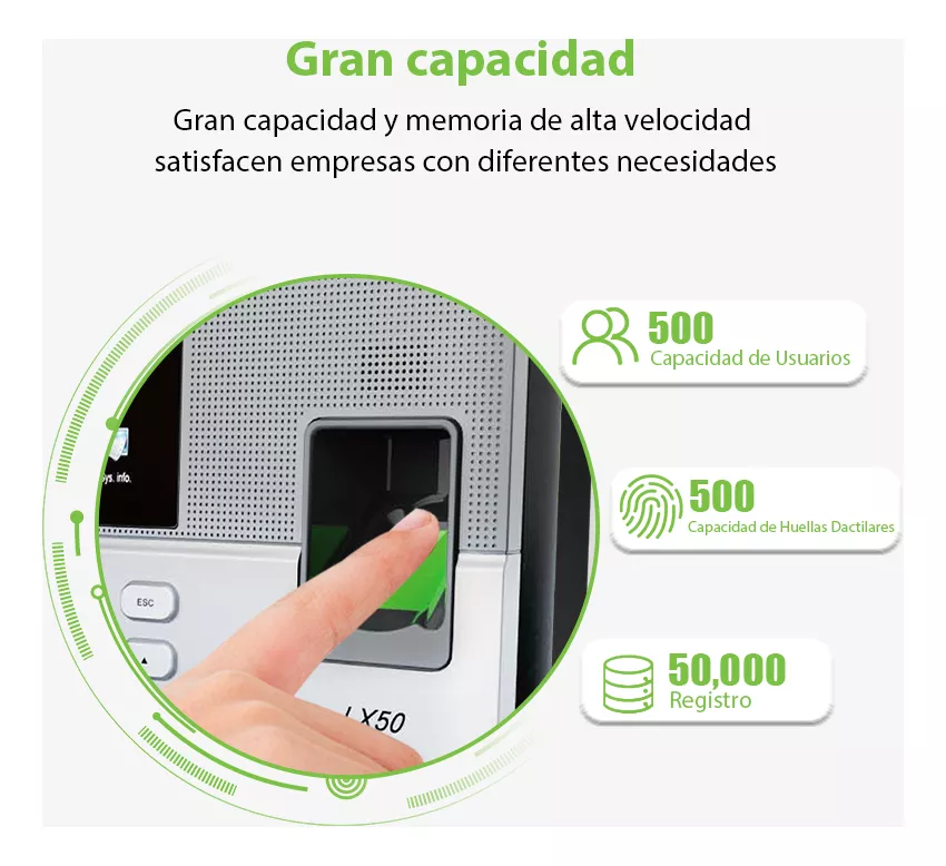 Esta terminal biométrico permite registrar hasta 500 personas y almacenar un total de 50,000 registros. Su pantalla a color TFT facilita la navegación en el menú, mientras que los avisos auditivos y visuales confirman cada marcaje de forma intuitiva. Las pequeñas oficinas, clínicas, consultorios o incluso instituciones educativas pueden implementar este dispositivo sin complicaciones.