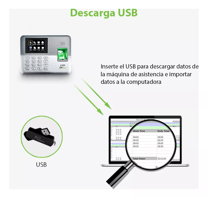 Uno de sus puntos fuertes es la descarga de información directamente desde una memoria USB, eliminando la necesidad de estar conectado a una red o depender de software para su funcionamiento básico. Este enfoque ofrece una ventaja notable para negocios que aún no cuentan con infraestructura TI robusta.