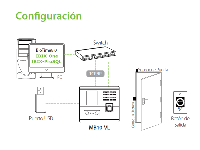 | Interfaz de Control de Acceso | Cerradura eléctrica de terceros, sensor de puerta, botón de salida |